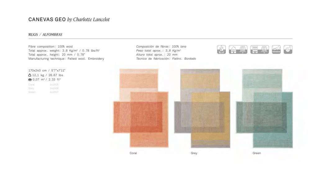 <p>A completely different application of the possibilities offered by the technique devised by Charlotte Lancelot for the Canevas collection. The manufacturing technique used to create this rug is felted wool. Using the same cross-stitch technique produced with coloured wool threads on a perforated felt base, Canevas Geo explores the nuances of colour and the various effects achieved when they are superimposed on each other. The colours in the weave intermix with each other on the Canevas Geo surface, recalling crop fields seen from the air. A composition with a truly fresh, contemporary look that has also opted for an asymmetric format in the shape of the rugs. Due to the handmade nature of the GAN product, slight variations in size, colour, finish are normal. </p>