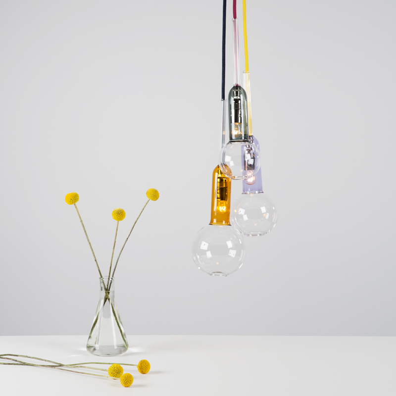 <p>The glass bodies in conturax and coloured glass expand to three sizes of glass spheres. This aids with the positioning when the glass is suspended from the ceiling. The yellow, grey and violet glass colours are elevated with dark blue, maroon and yellow cables.</p>