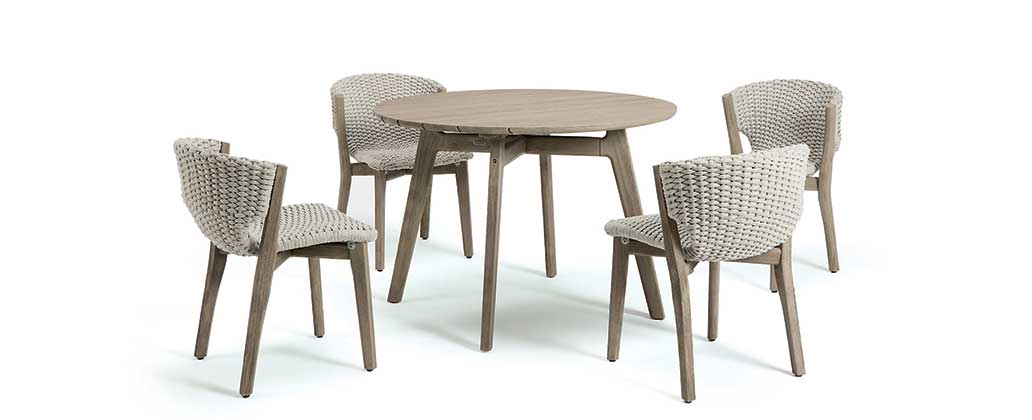 Knit is a complete line of tables, chairs and lounge chairs in teak and woven rope that expresses with refinement a perfect synthesis of aesthetics, functionality and ergonomics. The iconic collection is enriched by the new version in pickled teak and light gray rope and the rocking version of the lounge chair with high back, thus offering a new and special interpretation of the classic bergère.