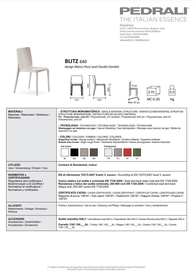 Stackable polycarbonate chair available in various colors, full color or transparent. The seat is etched and can accommodate a padded cushion fixed by a snap-fit system, upholstered in fabric or simil leather.