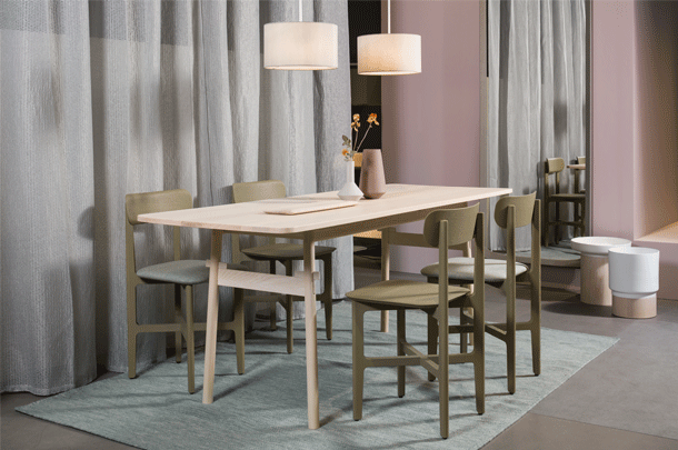 The TAUT table is available in white oiled ash, oak, knotty oak, colour stained oak, American cherry and American walnut with an oiled finish.