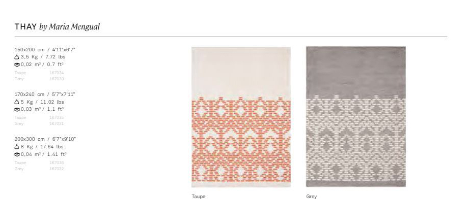 Geometry, repetition of shapes and neutral colors combine in THAY, a design by Maria Mengual that evokes the beautiful motifs of Thai fabrics and reinterprets the lines of traditional Persian kilims. The result is an elegant contemporary rug with an ancestral style, achieved thanks to the simplification of patterns and a neutral color palette.